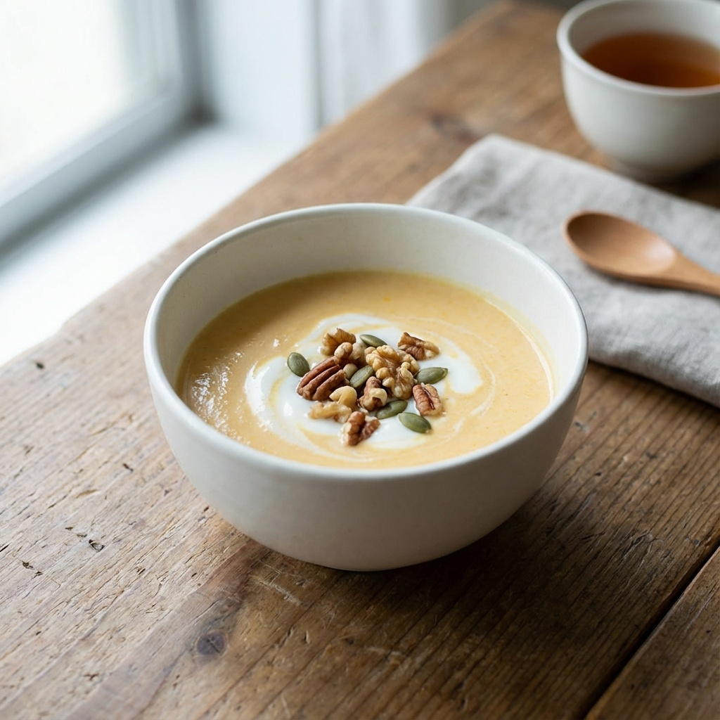 かぼちゃの甘みとヨーグルトの酸味が絶妙にマッチした冷製ポタージュ。ナッツの食感がアクセントになり、デザート感覚で楽しめます。朝食やおやつに、手軽にたんぱく質を摂りたい時におすすめです。