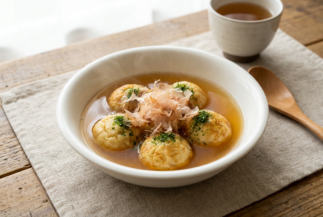 だしの旨みが効いた和風きのこスープを、明石焼き風にアレンジ。スープが染み込んだたこ焼きは、やさしく食べやすい味わいです。調理器具いらずで、朝食にも軽食にも使える一品です。