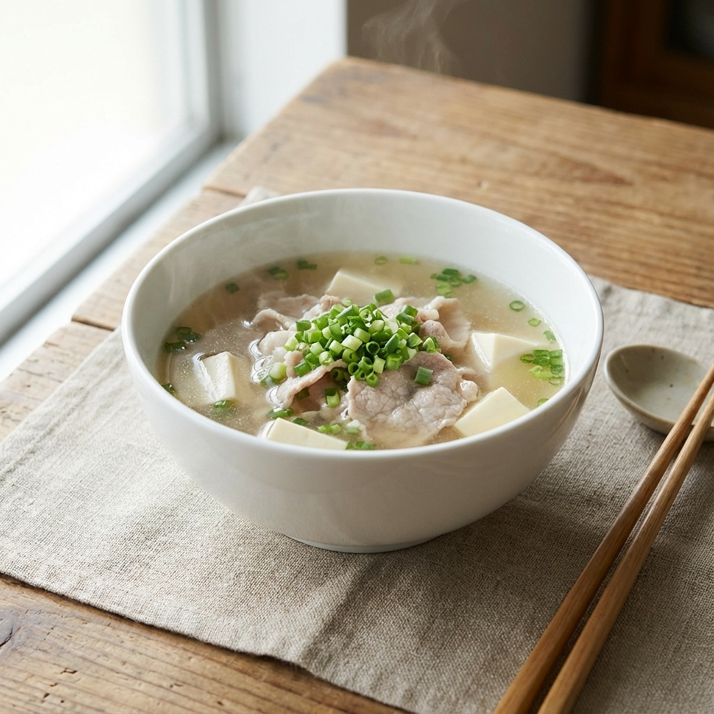 豚肉と豆腐、きのこの旨みがひとつに溶け合う、滋味あふれる和風スープ。たんぱく質をしっかり摂りたい日の朝にぴったり。電子レンジで手軽に作れる、満足度の高い一品です。
