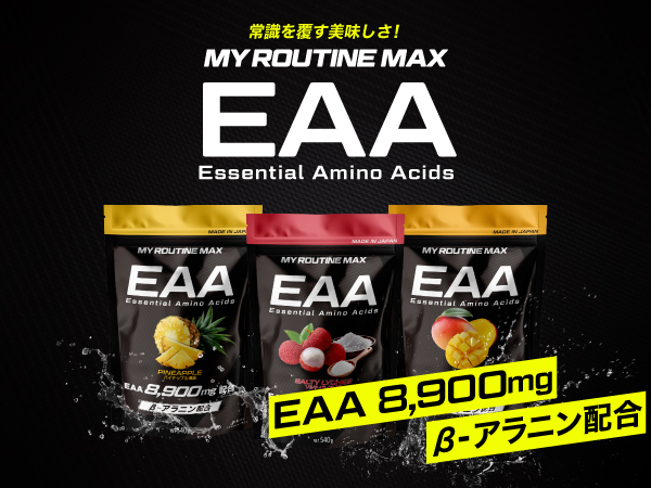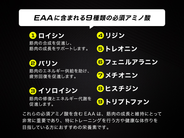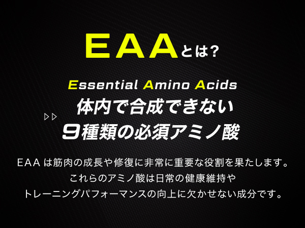 タンパク質を構成するアミノ酸は20種類あり、そのうち体内で合成できない9種類が必須アミノ酸(EAA)です。EAAは、健康維持やトレーニングサポートに欠かせない栄養素として知られており、以下の9種類が含まれています。(ロイシン、バリン、イソロイシン、リジン、トレオニン、フェニルアラニン、メチオニン、ヒスチジン、トリプトファン)
