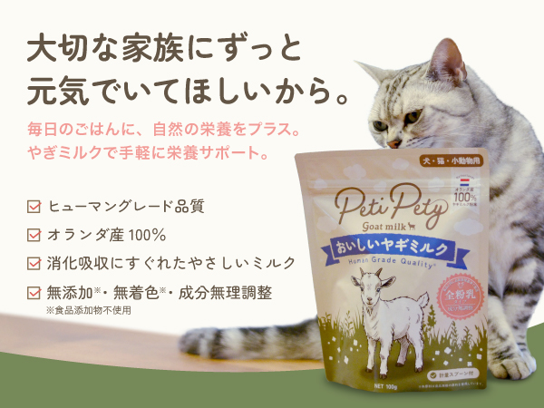 人間が口にしても安全なレベルのヒューマングレード基準で製造し、“ペットも家族”という発想から生まれた安心のナチュラルミルクです。