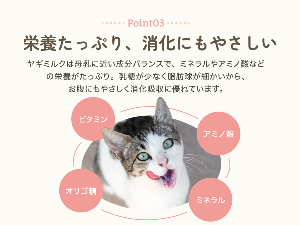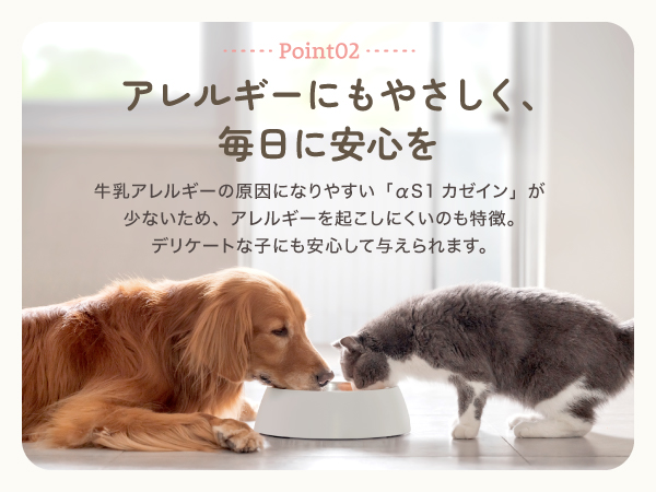 また、牛乳アレルギーの主因となる「αS1カゼイン」が少なく、敏感な体質の犬や猫、小動物にも与えやすい穏やかなミルクです。