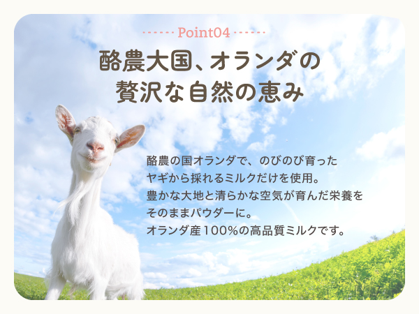 酪農大国オランダで育まれた高品質ヤギミルクを100%使用。