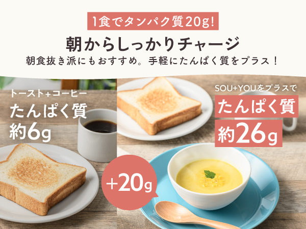 1食(40g)あたり、たんぱく質約20gをしっかり摂りながら、食事を抜きがちな忙しい朝でもカップにお湯を注ぐだけで体に必要な栄養と”ほっとする時間”を届ける朝専用のスーププロテイン。