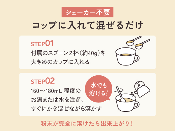 付属のスプーン2杯(40g)を大きめのカップに入れ、お好みに応じて、160~180mL程度のお湯もしくは水を注ぎ、すぐにかき混ぜながら溶かしてください。粉末が完全に溶けたら出来上がりです。