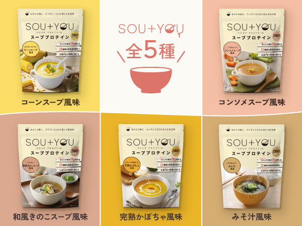 SOU+YOUのプロテインスープは、熱変性を受けにくい原料を使用しているので、カップにお湯を注ぎスプーンで混ぜるたけで、ストレスなく溶けるため、シェーカー不要です。夏は水を注ぎ冷製スープ、冬は温スープとして、季節を問わずお召し上がりいただけます。